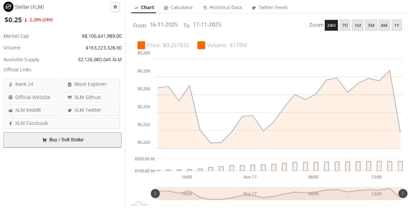 Ledger от BraveNewCoin сообщает, что XLM торгуется около $0.25, снизившись на 2.28% за 24 часа — падение, которое заставит плакать даже стоика. Рыночная капитализация? Аккуратные $8.1 миллиарда, с объемом в $163 миллиона, текущим как патока. А эти 32 миллиарда токенов? Они занимают 24-е место в крипто-бальном зале, танцуя с призраками бычьих мечтаний.
