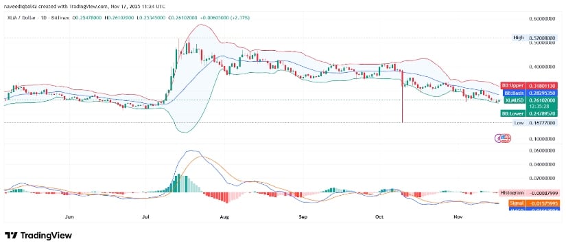 График TradingView показывает, что XLM зависает около $0.261, зажатый ниже полосы Боллинджера, как иголка в стоге сена. Полосы плоские, как блин в пончиковой, сигнализируя о рынке, сонном, как послеполуденная сиеста. Этот узкий диапазон был нормой в течение недель — скучно, но не без очарования.